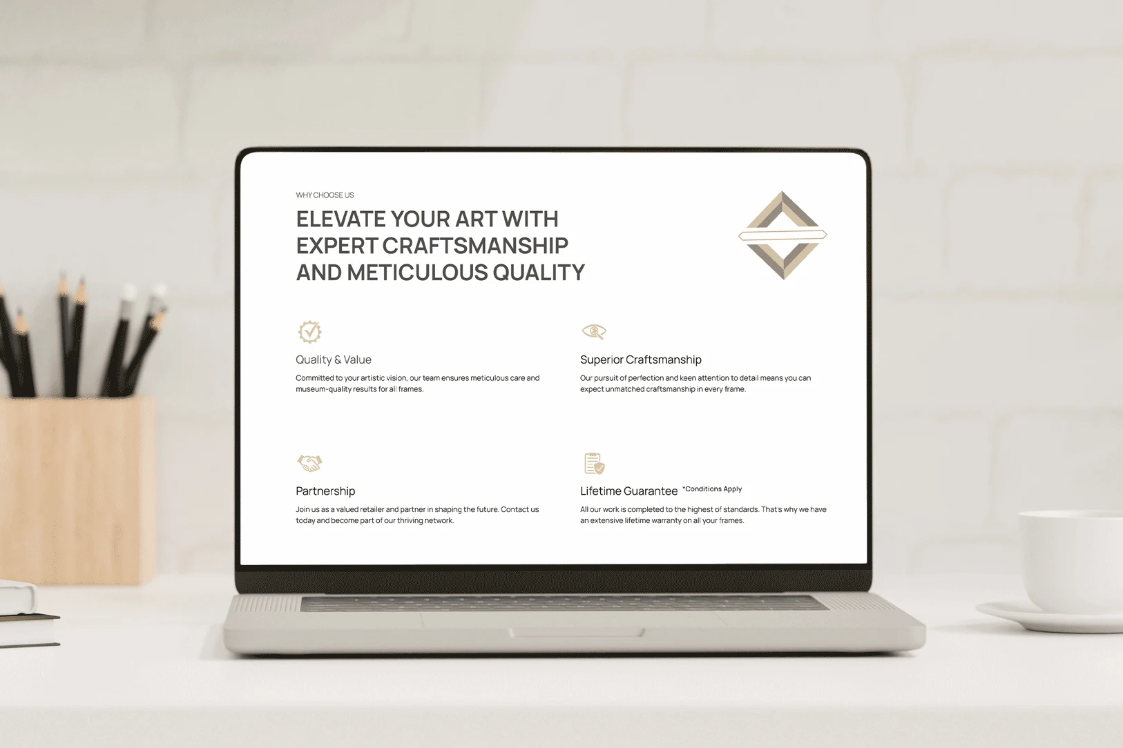 The website’s architecture was carefully planned to guide visitors through a logical journey of discovery. By prioritising user flow, we ensured that whether a visitor is a gallery curator seeking bulk orders or an individual artist looking for a single custom frame, they could easily find relevant information and make contact.
